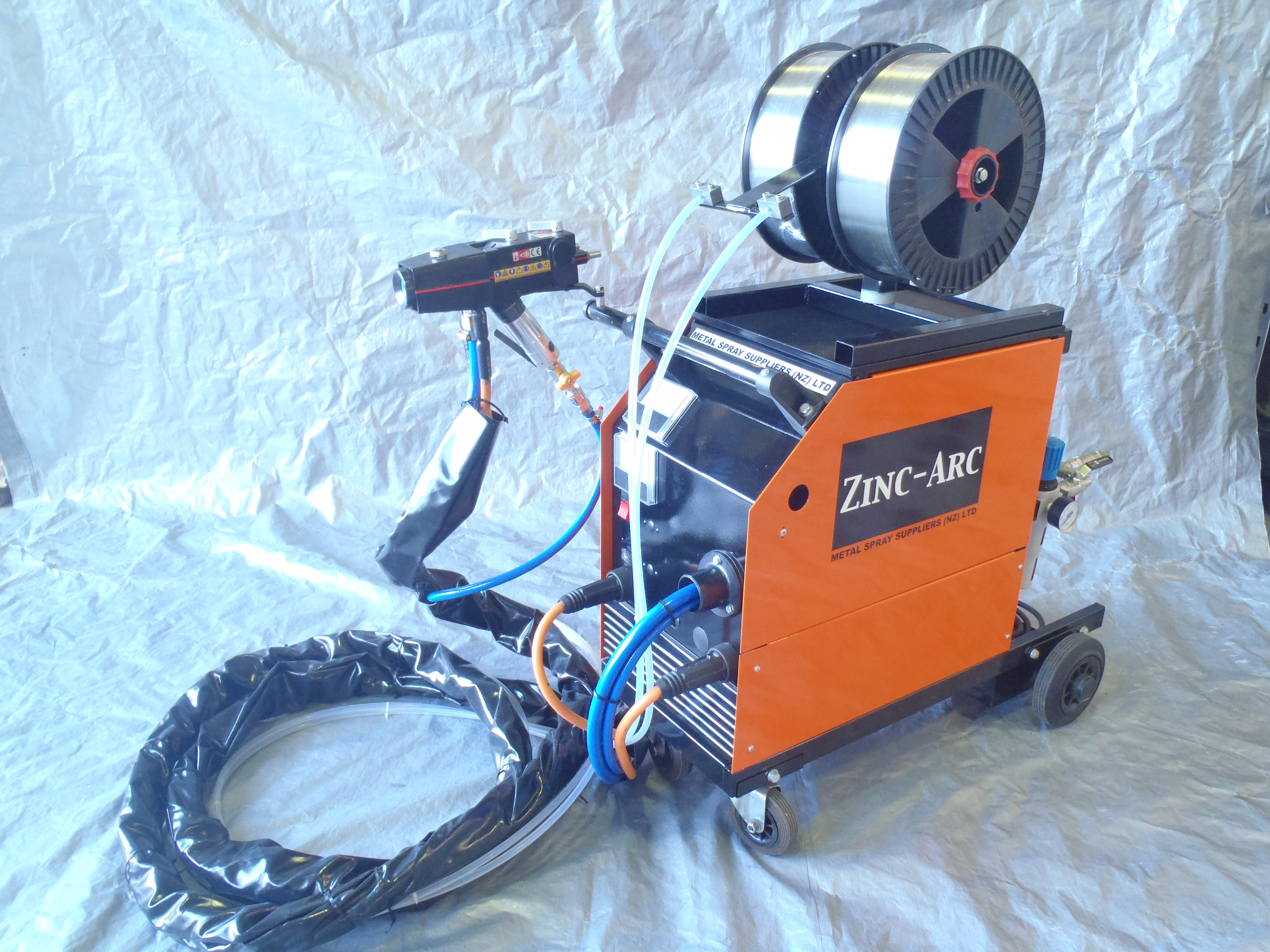Process: Two wires are fed into the pistol and electrically charged, one positive and one negative. The wires are forced together and form an electric arc, melting the wire. Compressed air, passing through a nozzle, atomises the molten metal and sprays it onto the work piece.